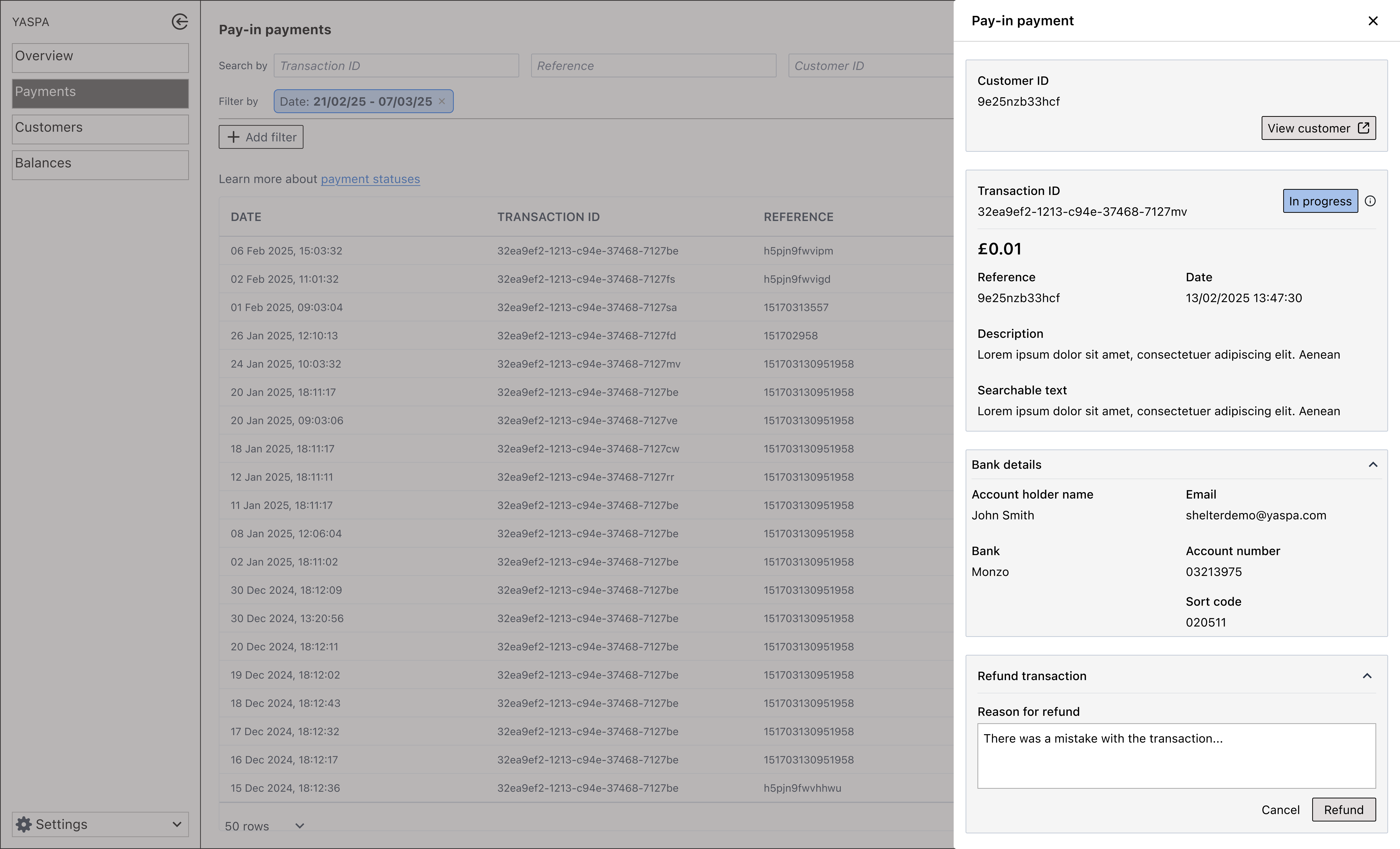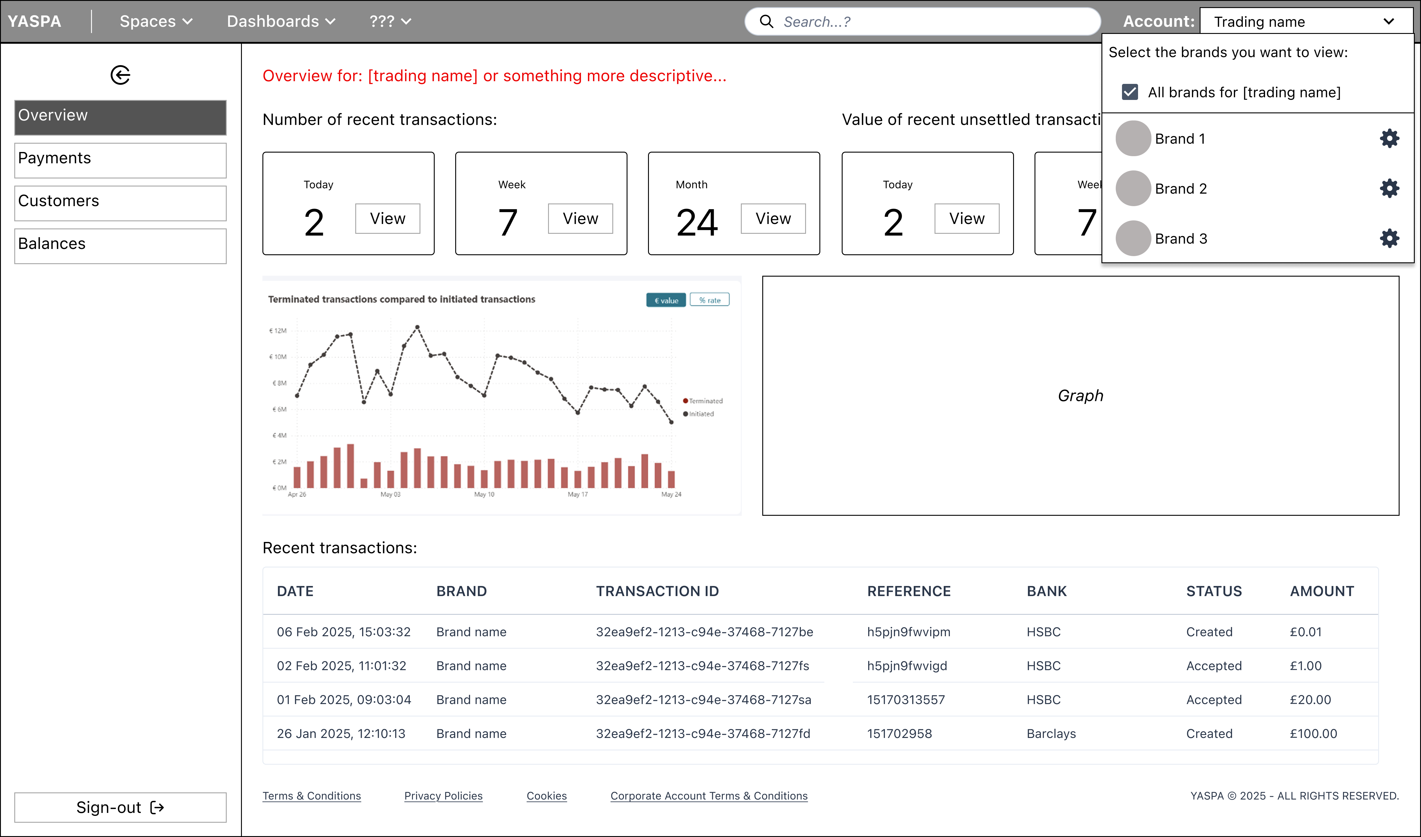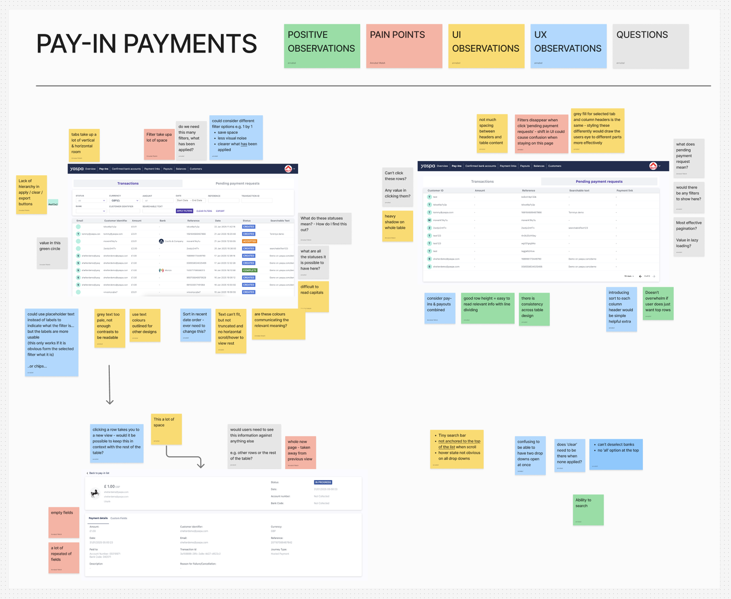Prior to joining the company, a design colleague had conducted interviews with three merchants who had recently integrated with Yaspa. These customers were asked open ended questions regarding their recent experience with the dashboard. A standout finding from this was checking the status of a transaction was a crucial task. It was also reported that some filters do not work reliably, and more analytics on both customers and transactions would be helpful.