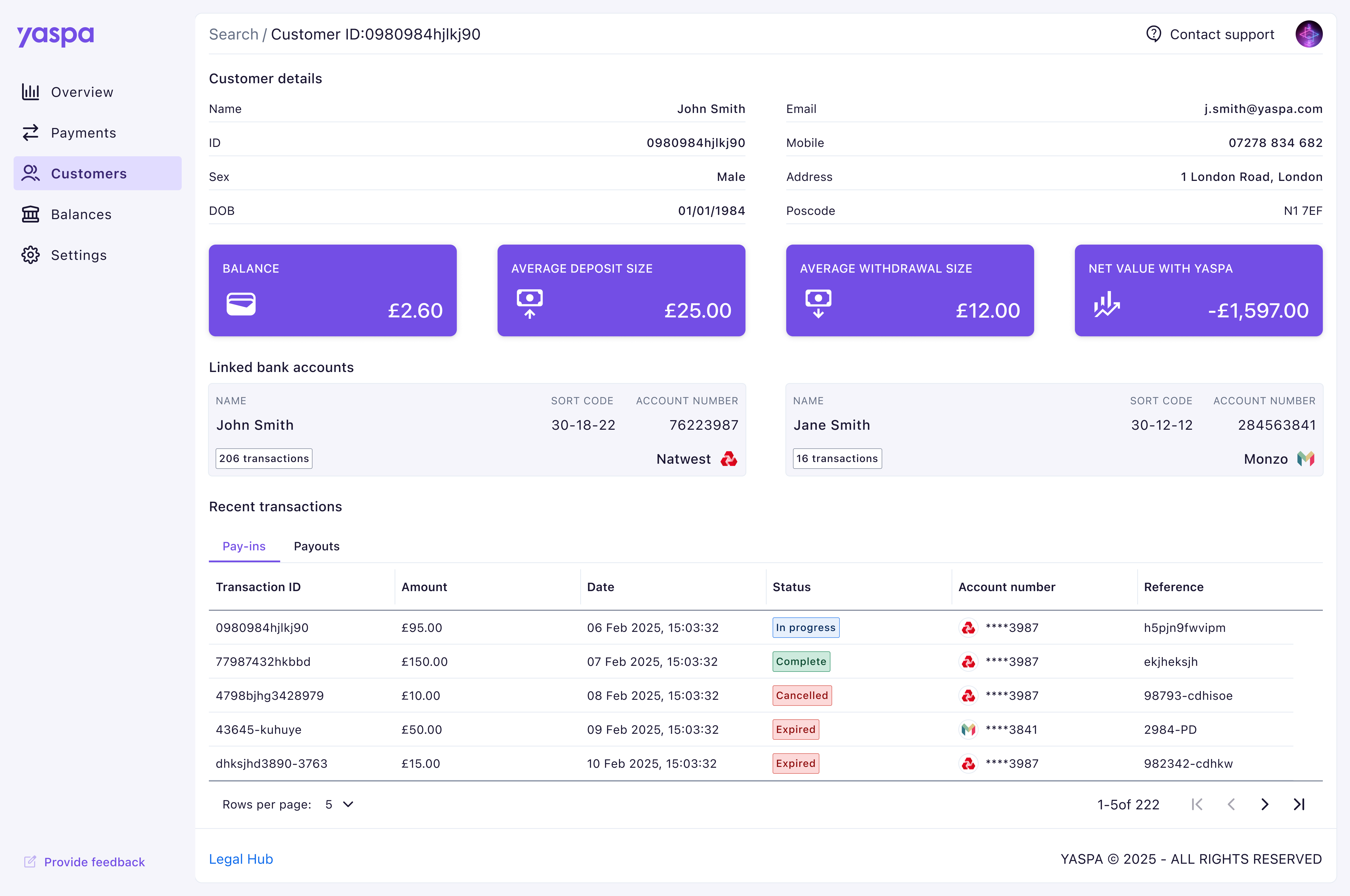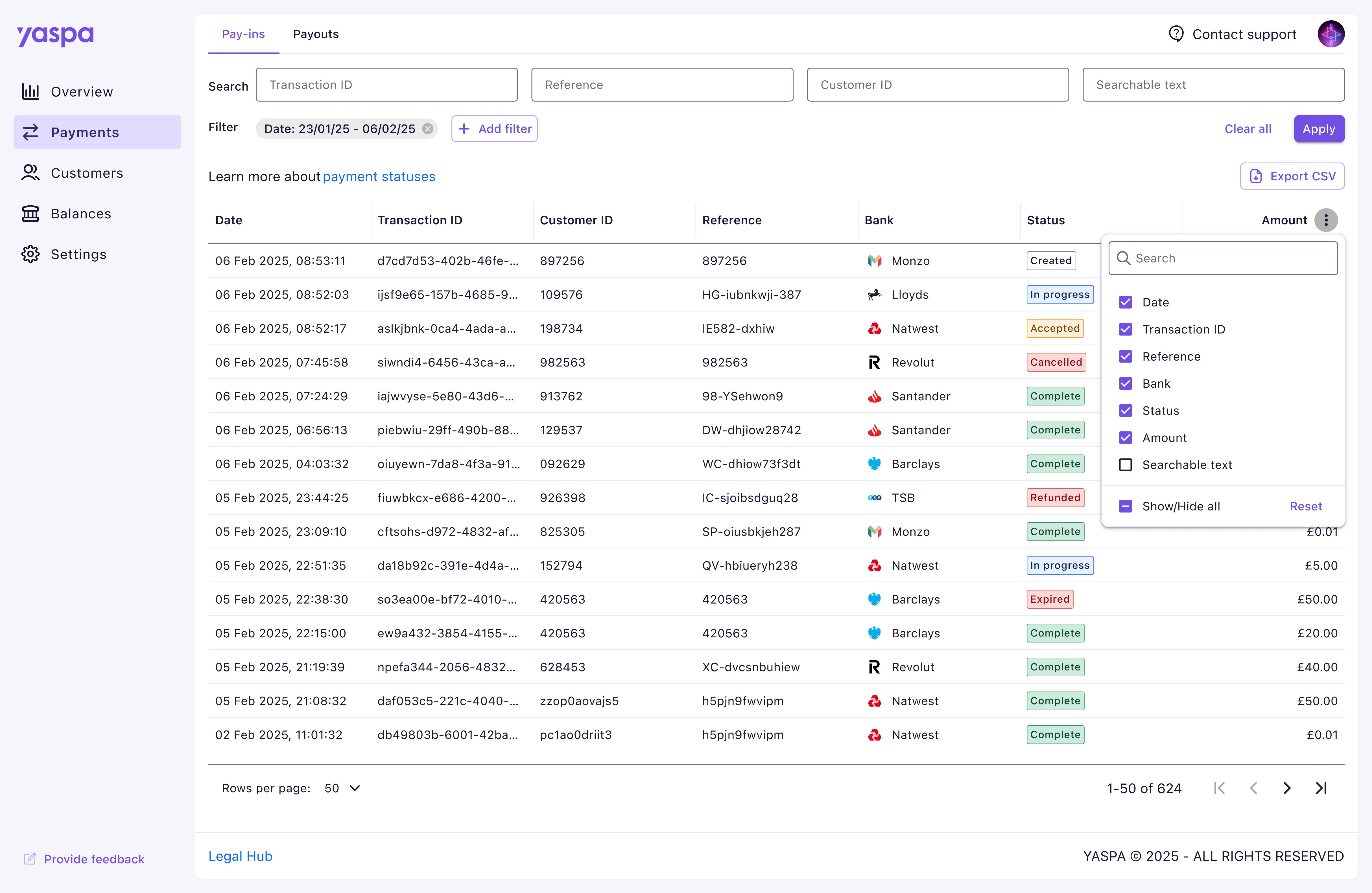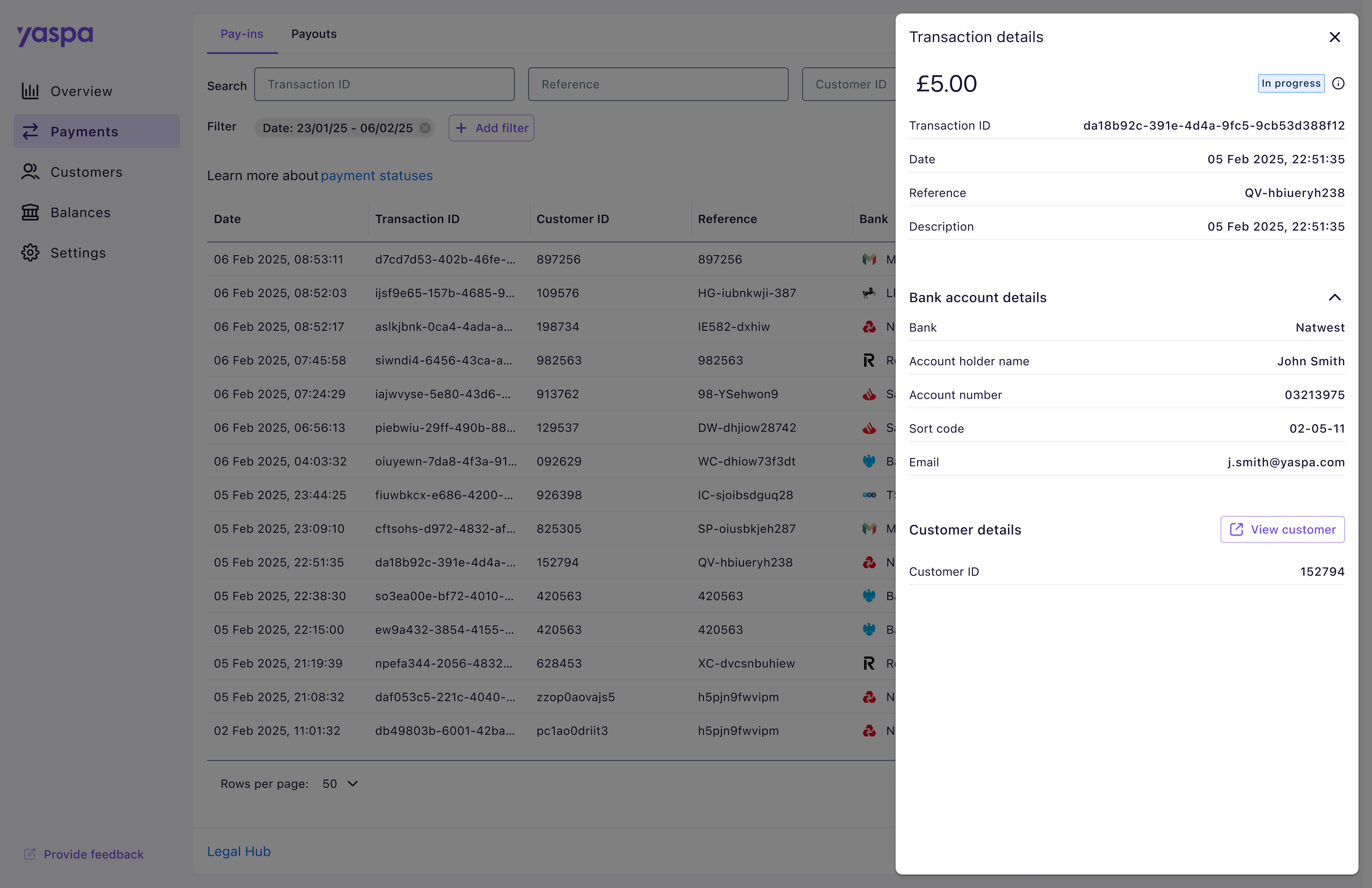 The admin dashboard at Yaspa is a crucial B2B communication tool, documenting data on open banking transactions.