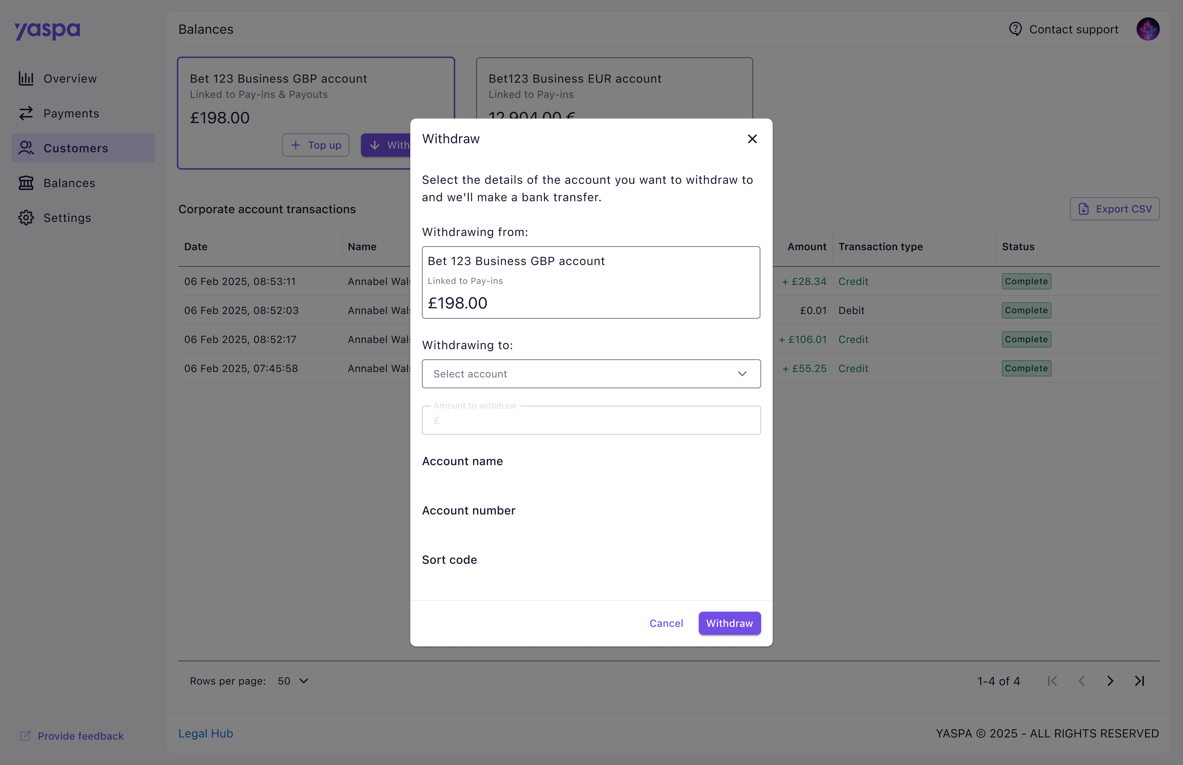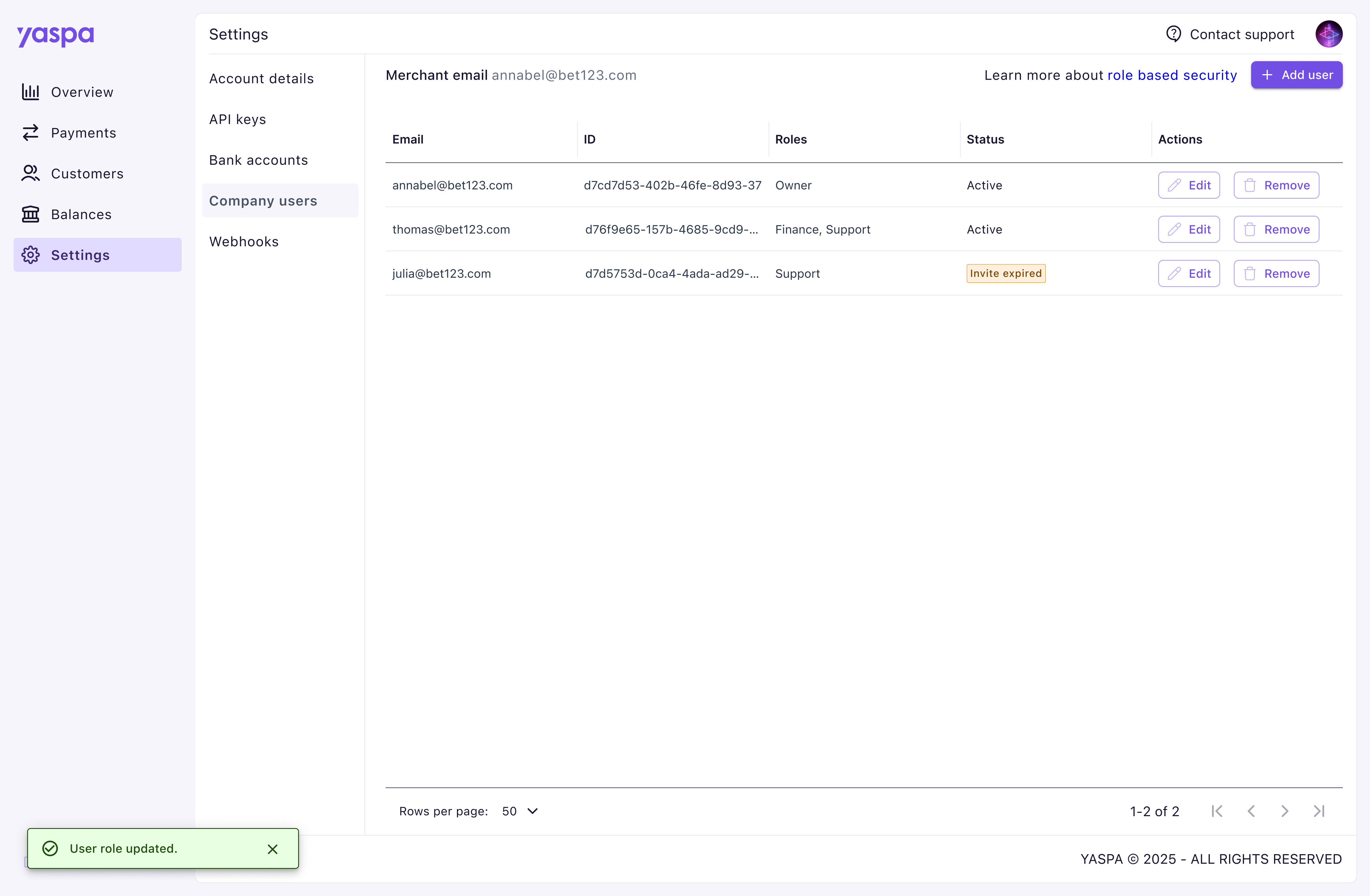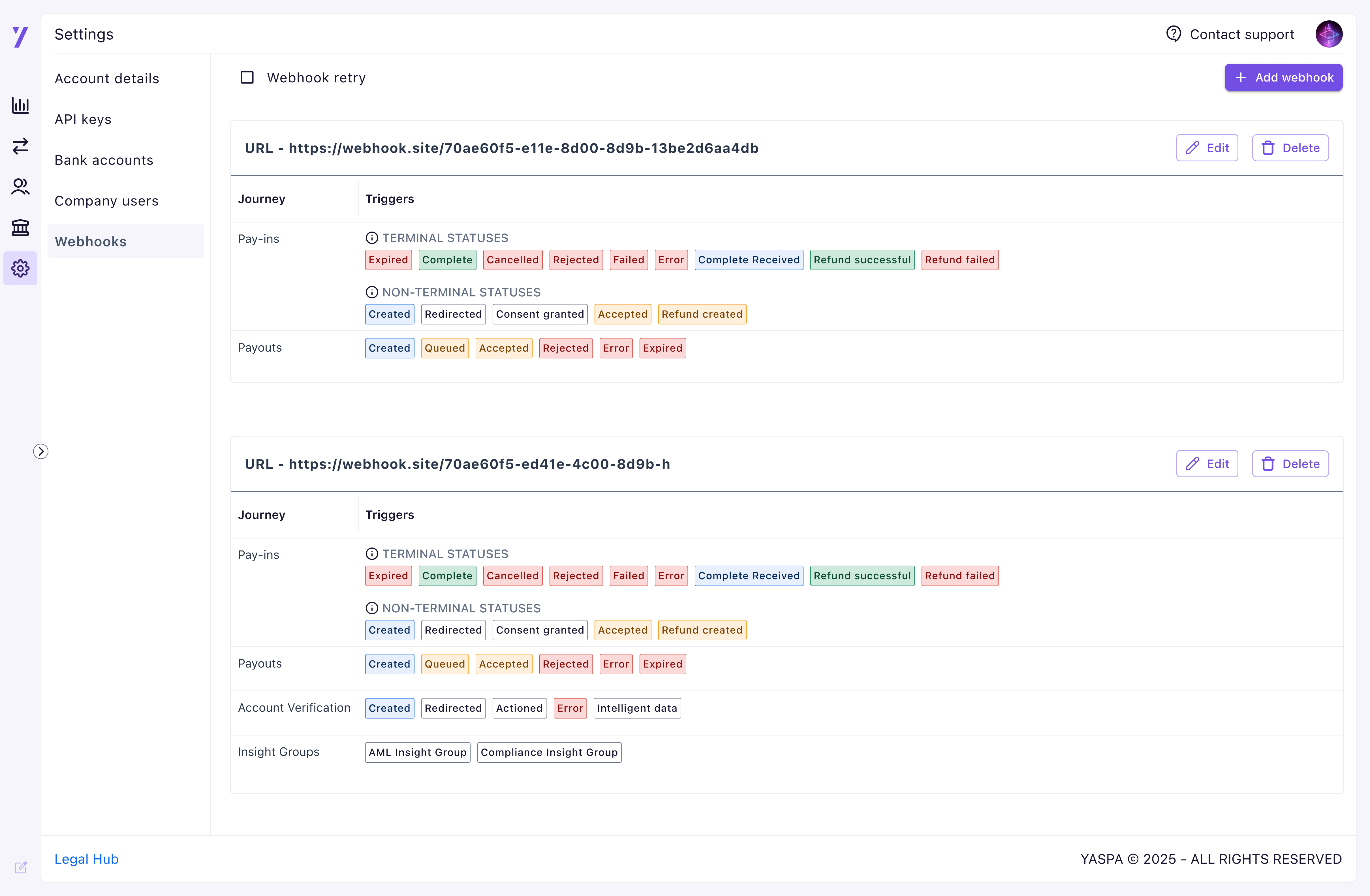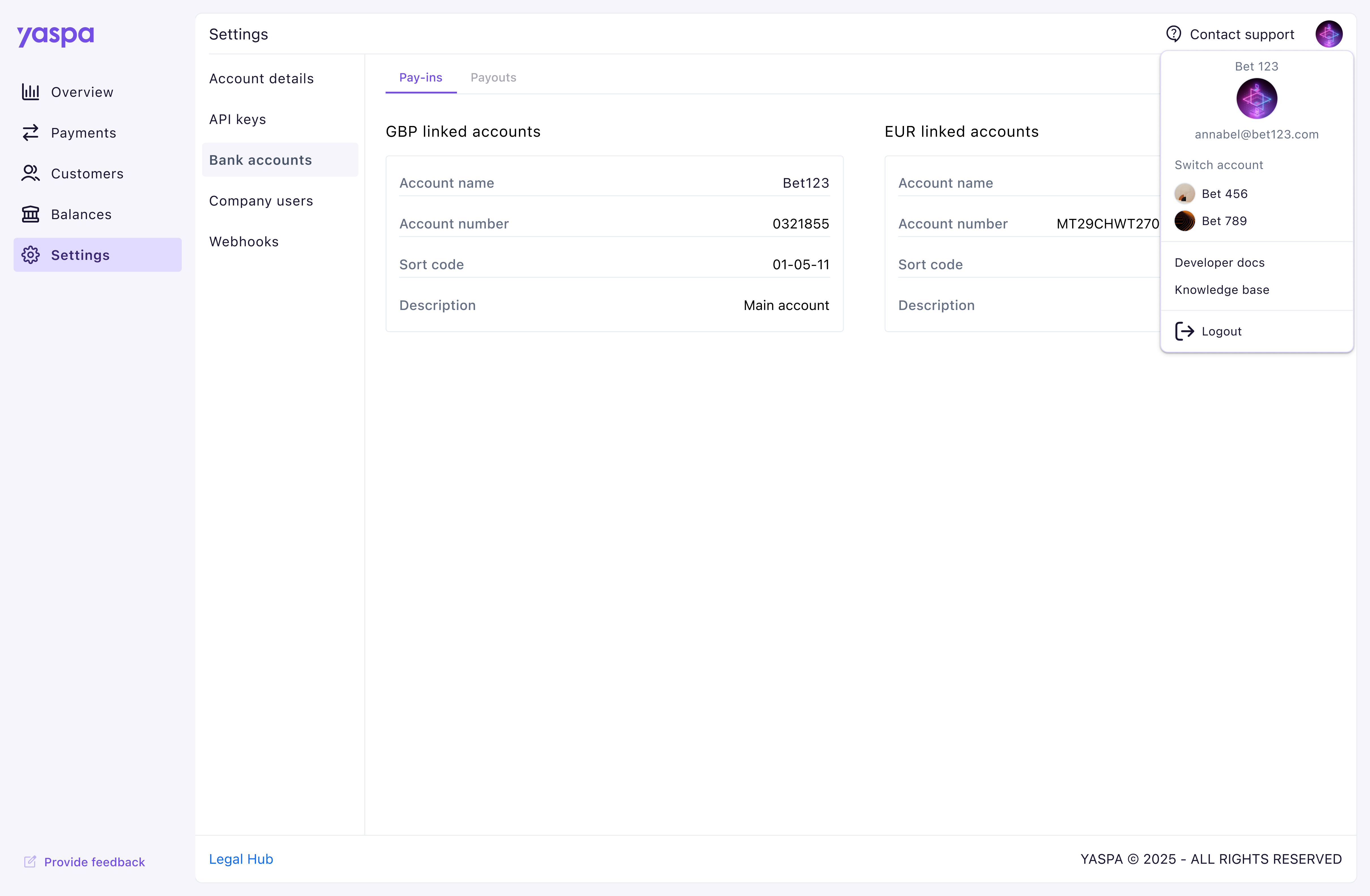 The admin dashboard at Yaspa is a crucial B2B communication tool, documenting data on open banking transactions.