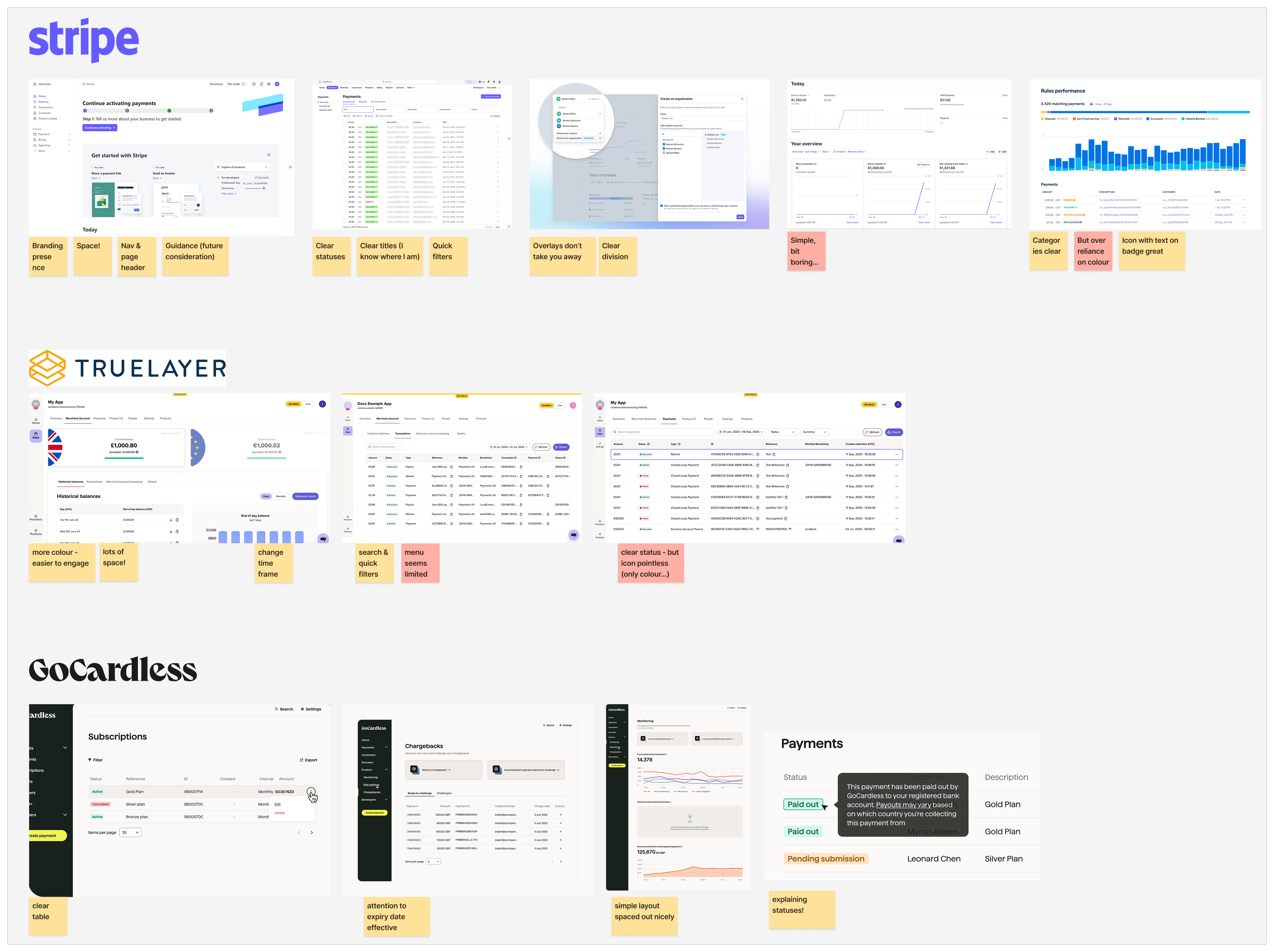 A critique of relevant payment dashboards including Stripe, GoCardless and Truelayer, taught us the need for a calm visual hierarchy. The data-heavy reality of payment information requires key metrics to be scanned, with further details easily accessible when required. Common patterns included drilling down from high level grouped transactions, to individual details close by on overlays or modals.