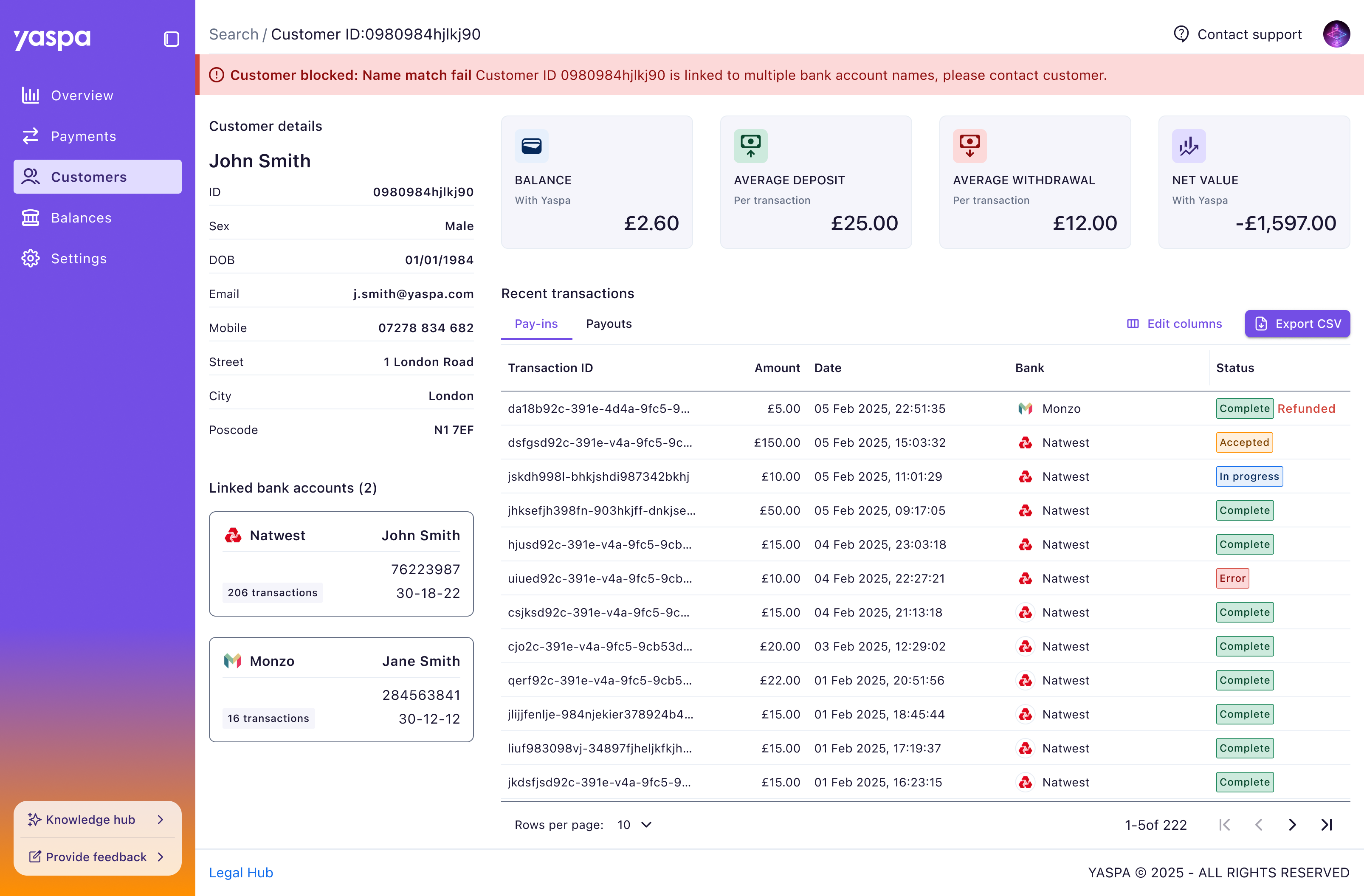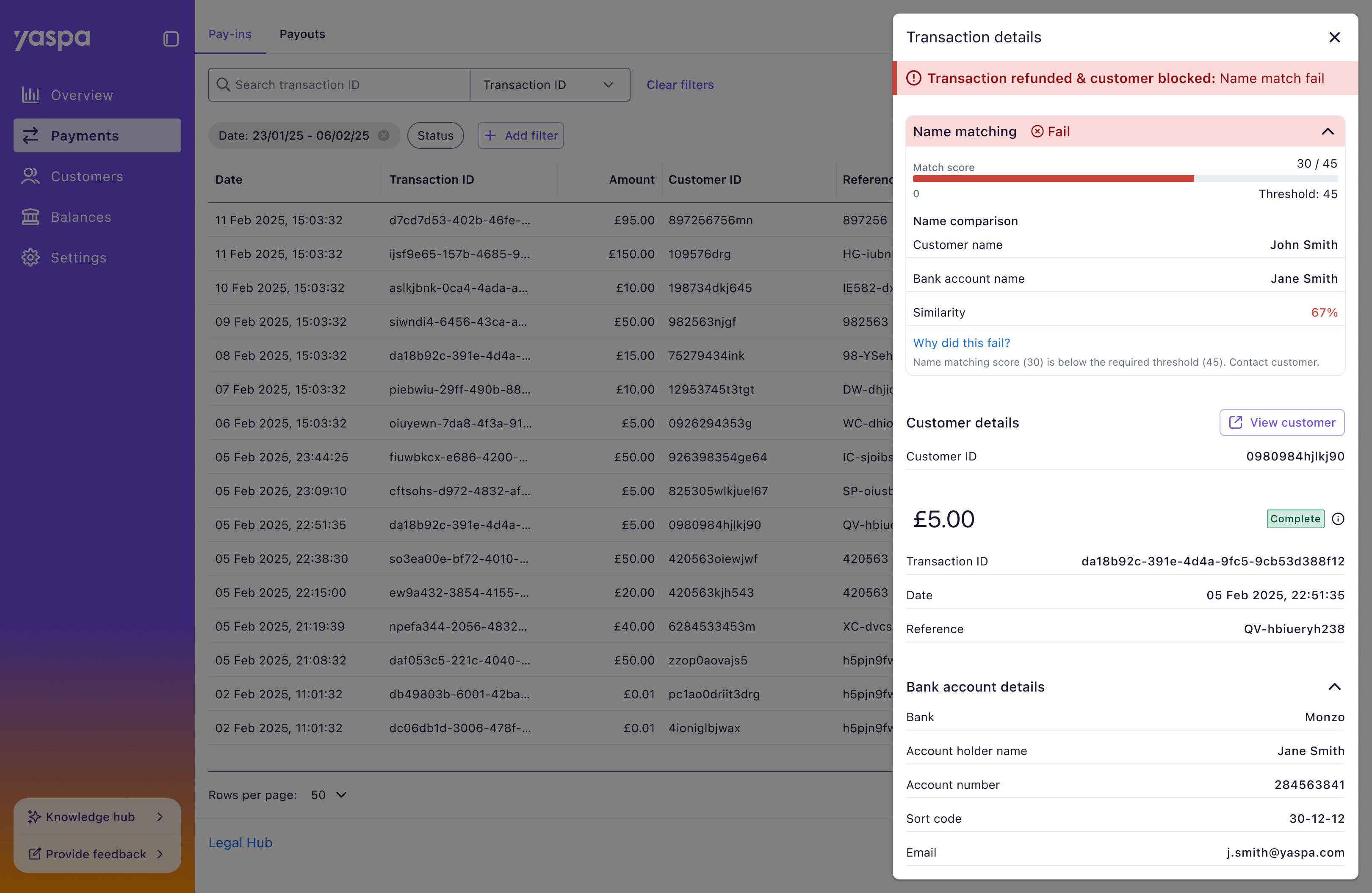 The biggest update to the dashboard was delivered through name matching technology, a huge technical undertaking in open banking, which we added to our product offering. This helps block fraudulent transactions using a score system to review names saved on merchant accounts against the one on the payment method. This was especially welcomed by merchants due to it being such a massive compliance issue and causing them to lose money through benefit cheats.
