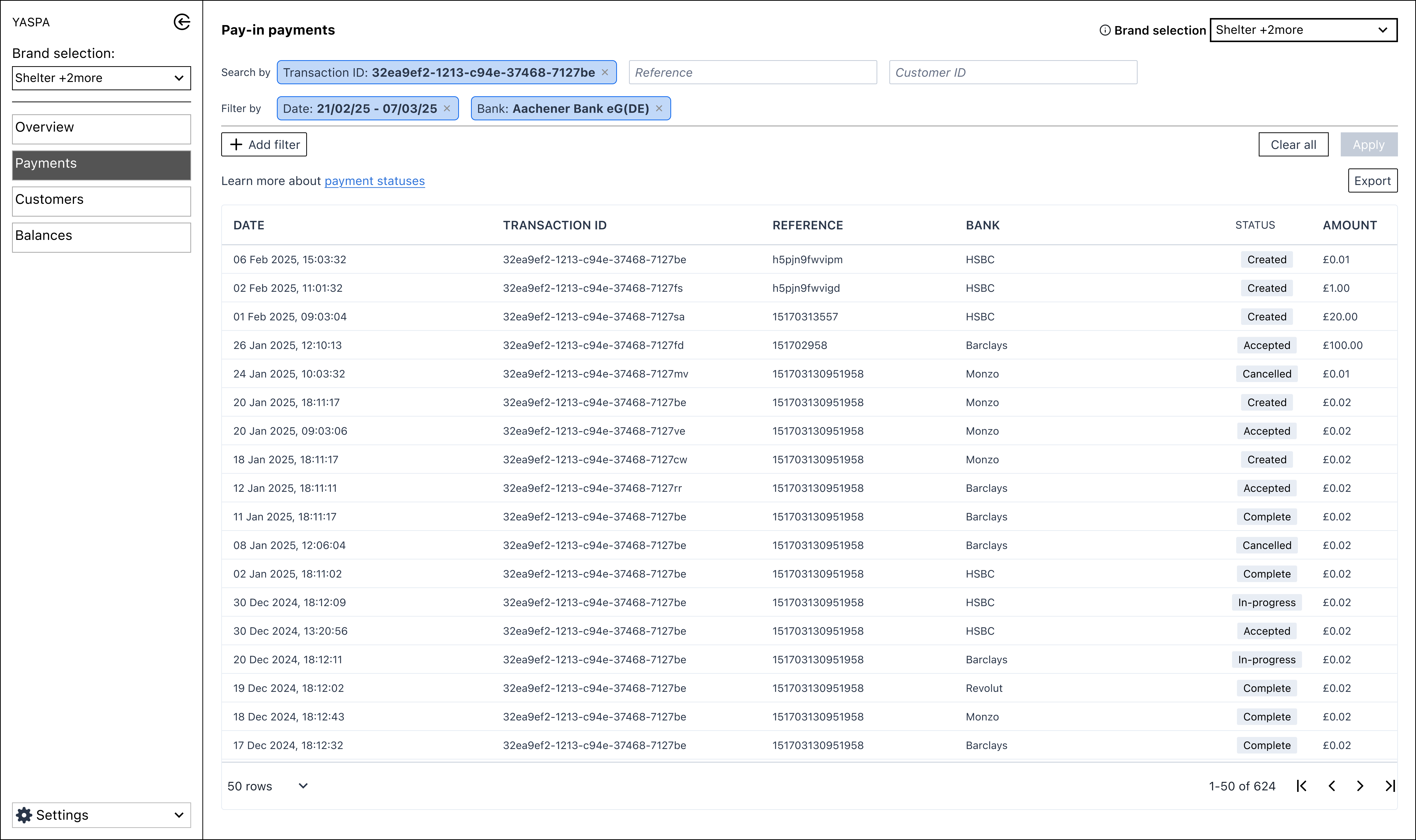 The payment pages were previously divided into two separate menu sections, but as these products are so closely related, we rearranged them into tabs to connect them and save on space. We then improved the search and filter functionality above the payments table, which was the most requested change in this project.