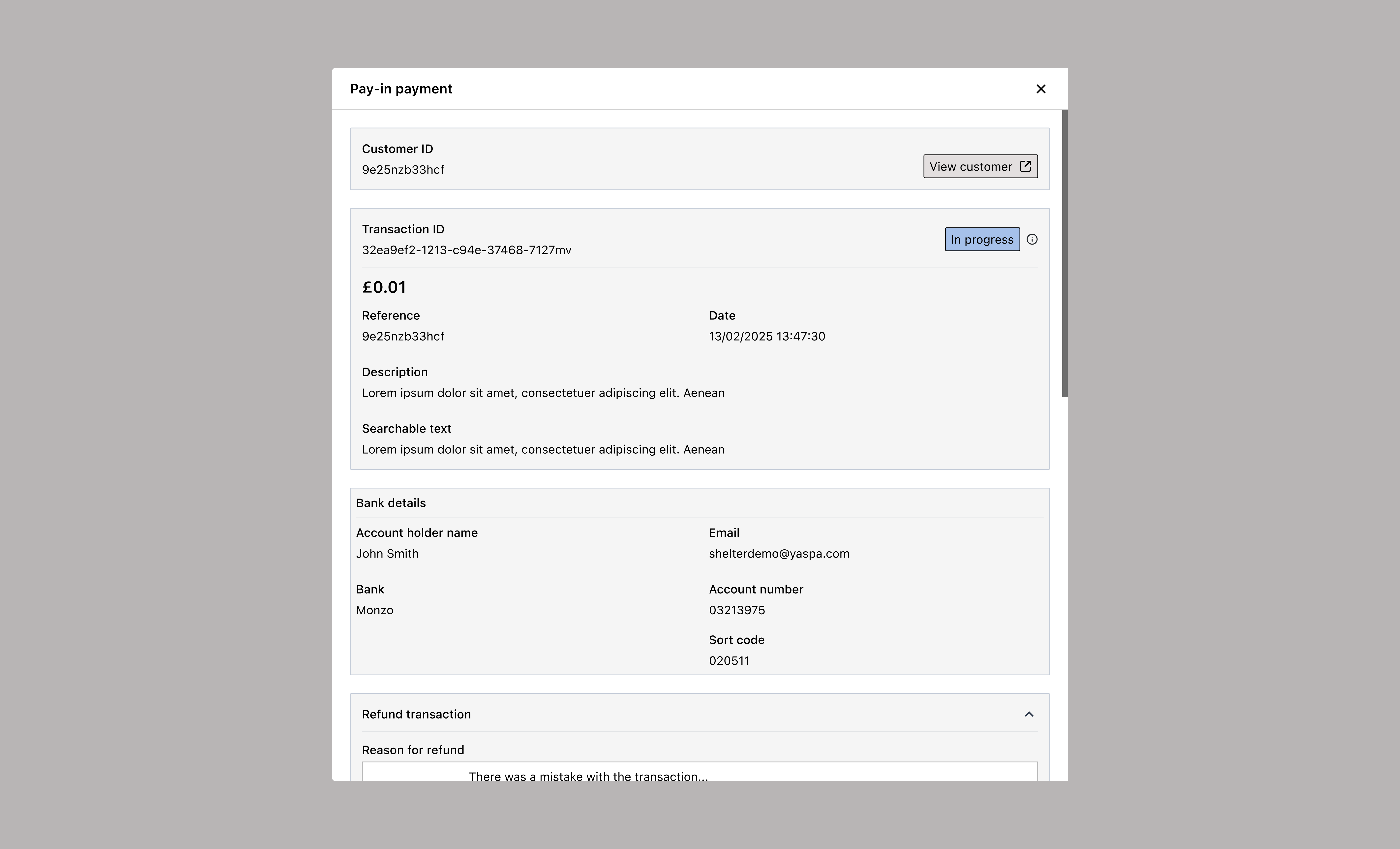 Each row on the payments table contains information about a single transaction. Further details then show on an overlay when a row is clicked. We changed the layout of this detailed information from a whole page view, which took you away form the table, to an overlay, which keeps the user in the same space and allows them to return to the table more easily. We focused on improving readability of this section with an underline connecting labels with the content.